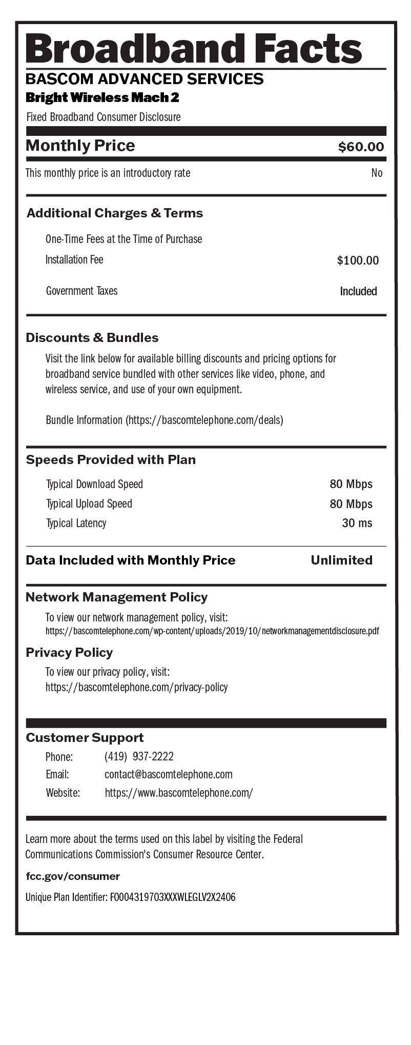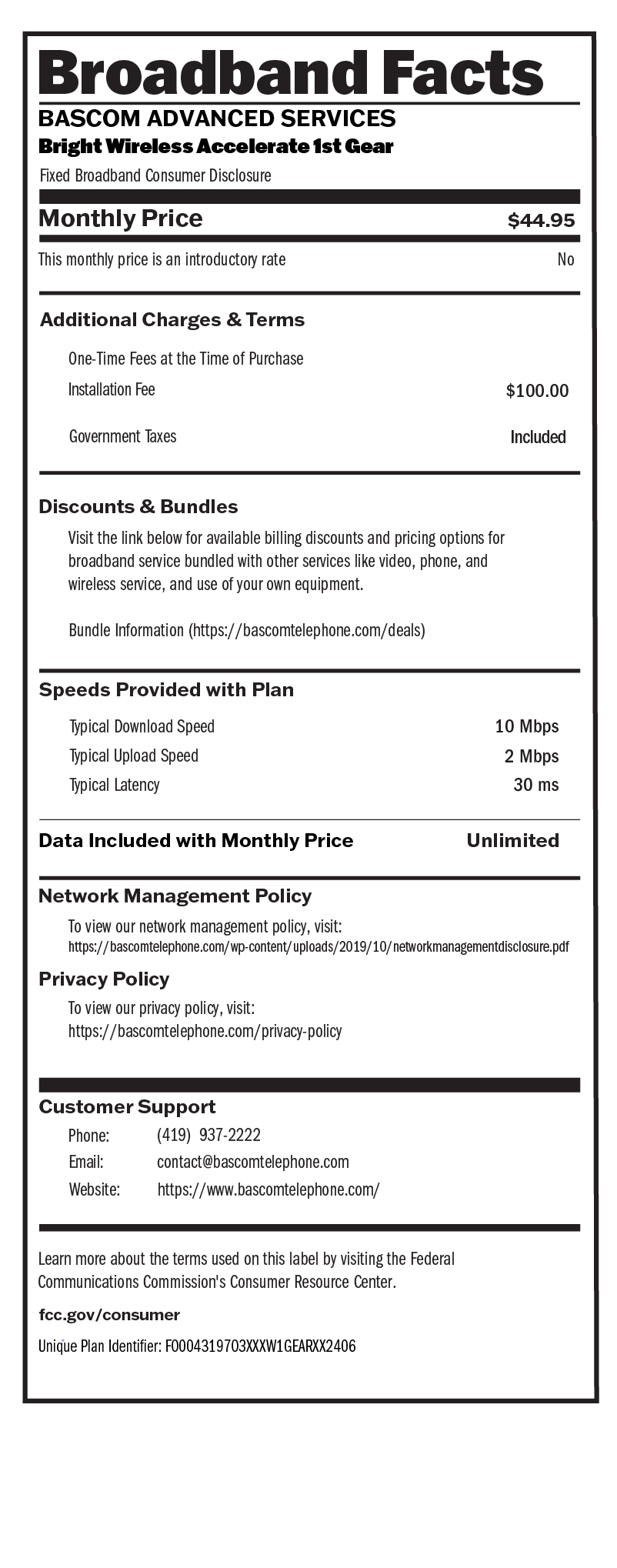 - Installation $100 and first month’s service paid up front.